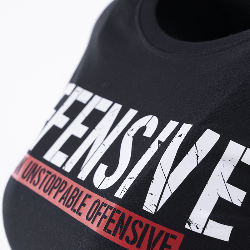 On the left sleeve there is a large red label with the Offensive sign sewn on. T-shirt is decorated with a simple, but very characteristic large print - OFFENSIVE, under which there is a smaller note „An Unstoppable Offensive” on the red background.