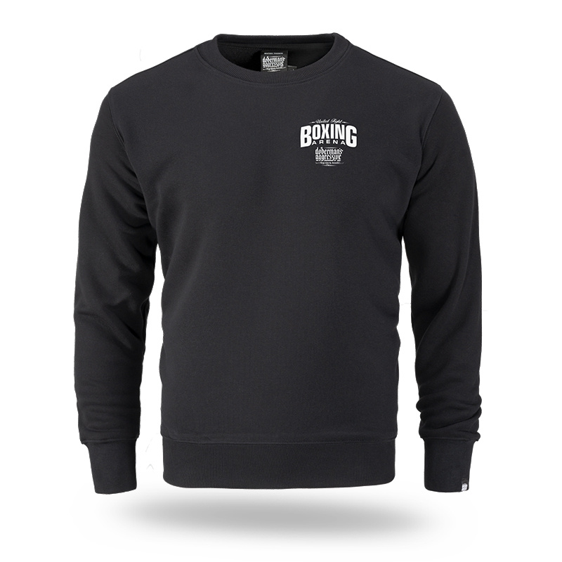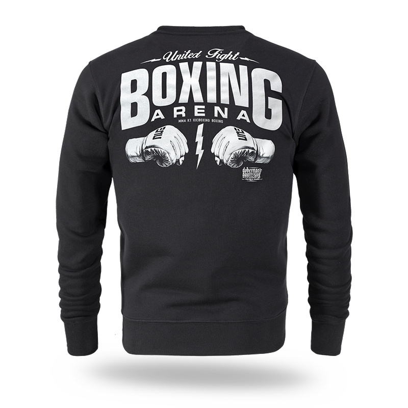 Model with a sporty graphic print on the back, depicting clenched MMA gloves and the inscription “Boxing Arena”. In the background, there are smaller inscriptions: MMA, K1, KICKBOXING, BOXING. A smaller print referring to the main motif is placed on the chest. Comfortable cut made from high-quality cotton. Model designed for combat sports practitioners.