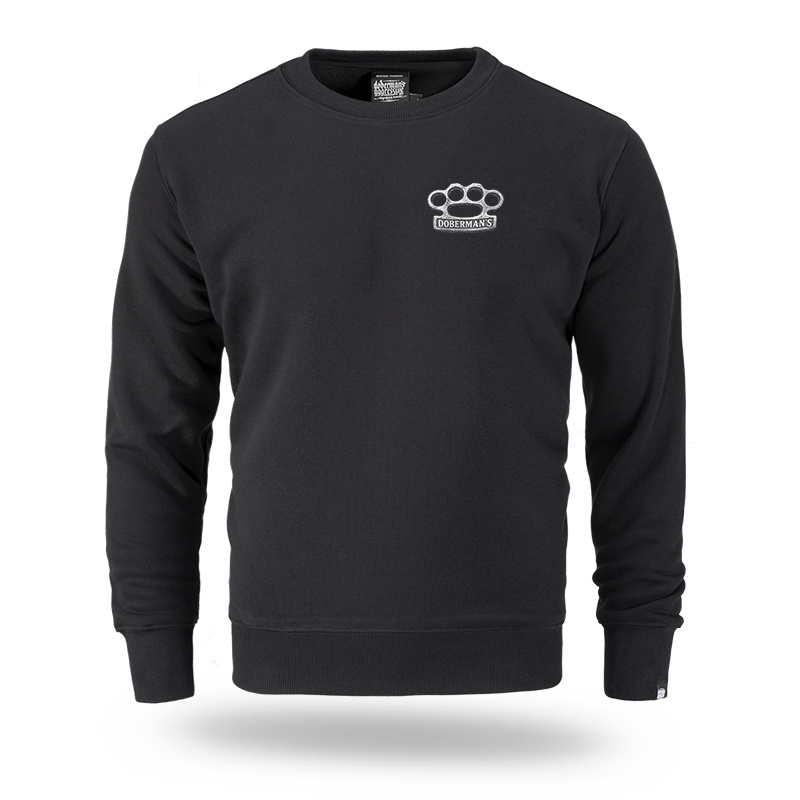 On the back, there is a bold print featuring brass knuckles, butterfly knives, clenched fists, and a figure in a balaclava. Below are the slogans: Loyalty. Brotherhood. One crew. and One for all, all for one. On the front, at chest level, there is a smaller print with brass knuckles and the Doberman's inscription.