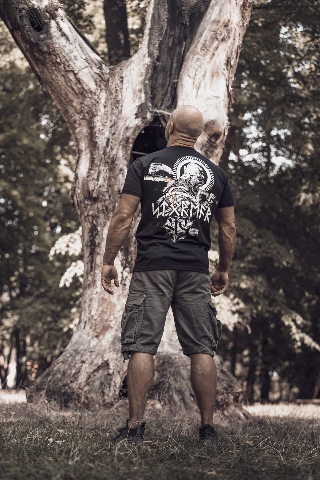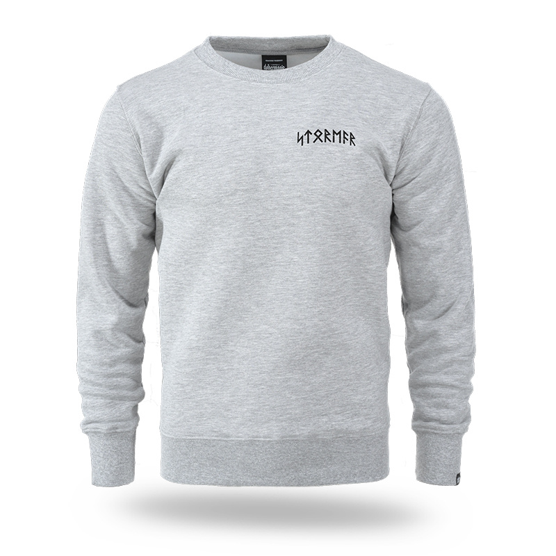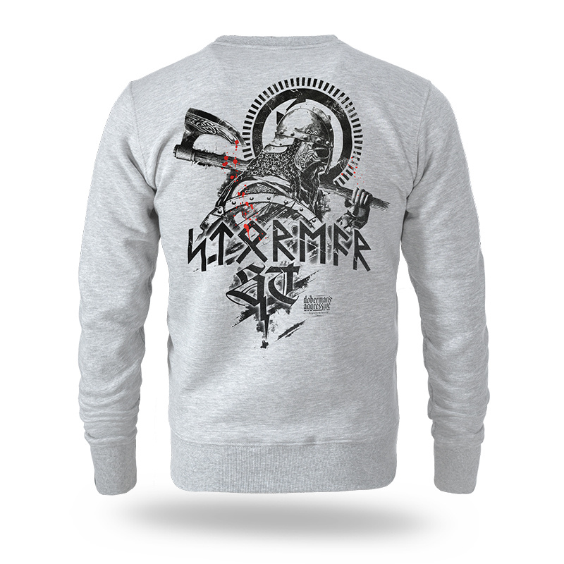 The model stands out with an impressive back print featuring a Norse warrior in a helmet, holding a shield and an axe. The design is completed with a large “STORMER” inscription styled in runic alphabet, which also appears on the front chest.