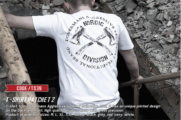 Cut of T-shirts is standard, the composition of the material is 100% cotton with a weight of 200 g. Large print in a form of a circle. The model contains the name of the brand, two crossed axes and a "Nordic Division" inscription. On the left chest side there is the same print as on the back applied in a smaller format.