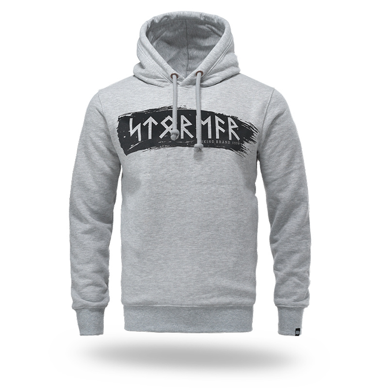 Model featuring a large front print – STORMER – VIKING BRAND 1999, styled to resemble runic script. The hoodie has an adjustable hood, a kangaroo pocket, and ribbed cuffs and hem. Made of high-quality cotton.