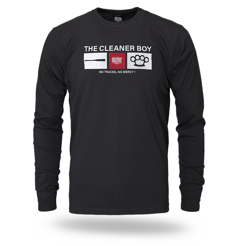 In the center, there is a print with the inscription "THE CLEANER BOY" and graphics showing a bat, the brand logo, and brass knuckles. Below, the slogan: "NO TRACES, NO MERCY!". The product is made of high-quality cotton, ensuring wearing comfort.