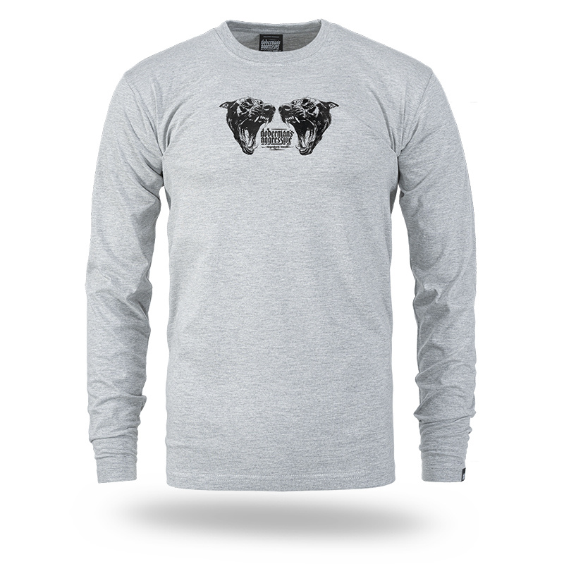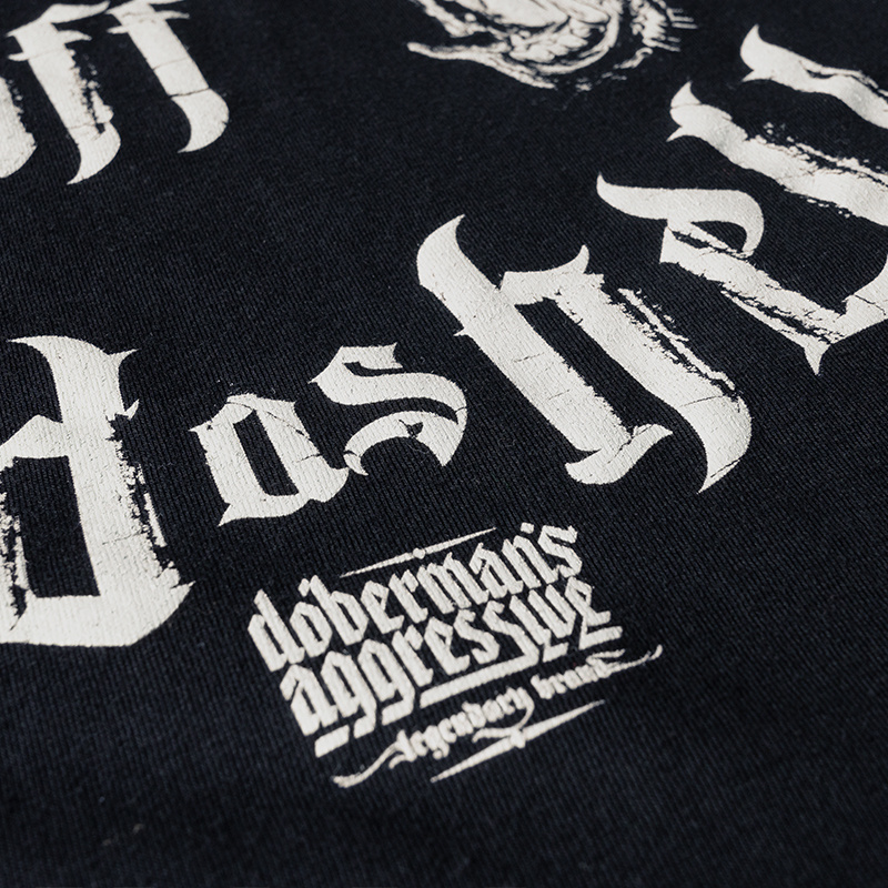 Model featuring a bold back print with two enraged Dobermans and the slogan “Dobermans off mad as hell”. A smaller print with the same graphic motif is placed on the front.