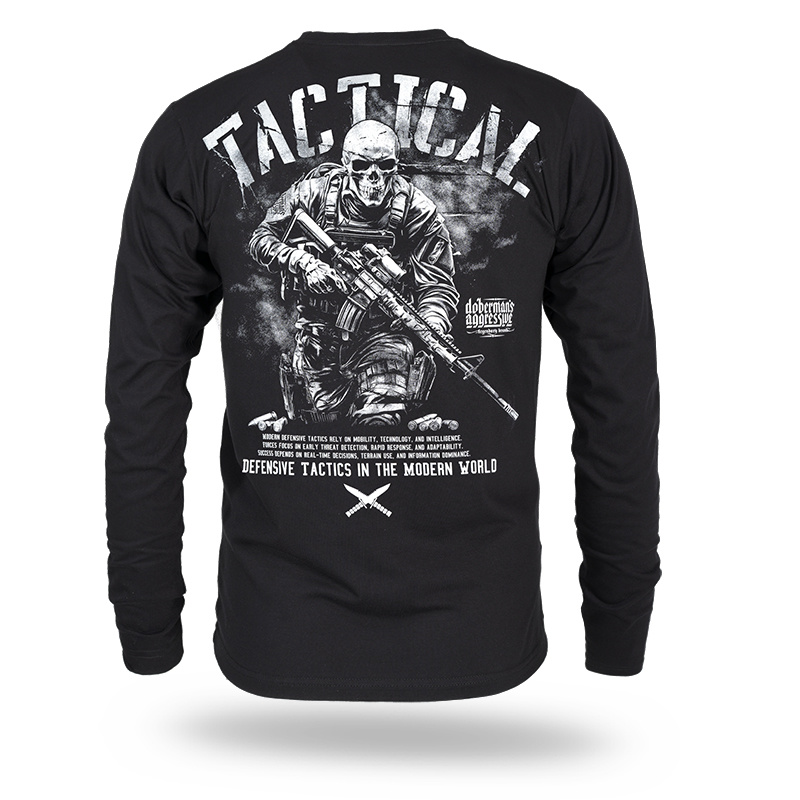 On the back, there is a dynamic print showing a skeleton with a rifle in a combat composition with the slogan "TACTICAL". Below it is the phrase "Defensive tactics in the modern world" along with additional English text. A smaller graphic motif with two crossed knives is placed on the front.