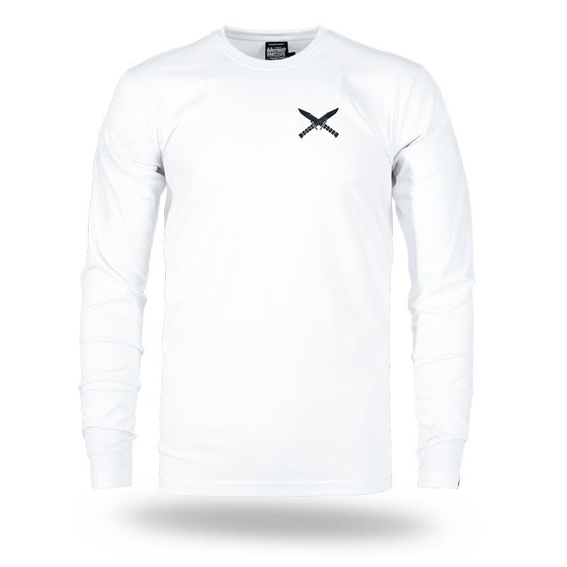 On the back, there is a dynamic print showing a skeleton with a rifle in a combat composition with the slogan "TACTICAL". Below it is the phrase "Defensive tactics in the modern world" along with additional English text. A smaller graphic motif with two crossed knives is placed on the front.