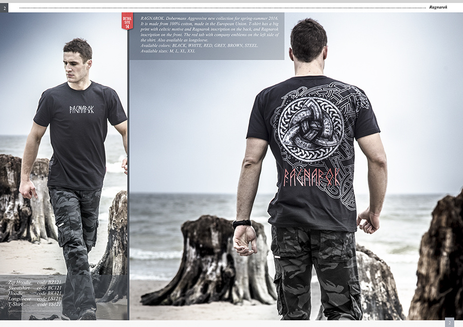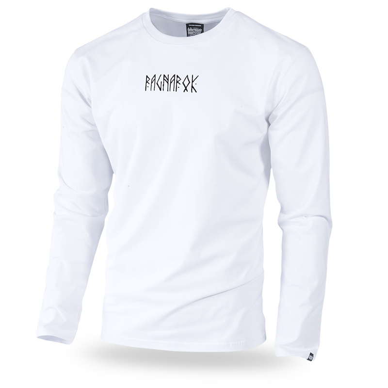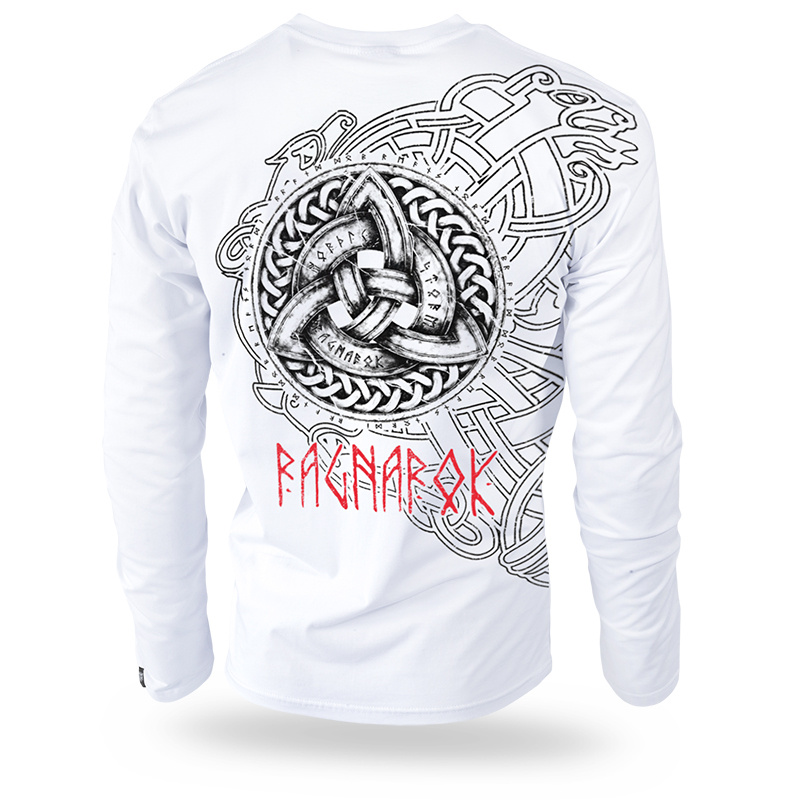 Standard cut, straight long sleeve. Red details: internal trim at the neck and side insert. A large graphics with Celtic symbol on the front. The worn effect used. Around the pattern there are ornaments overlapping the left shoulder. At the bottom there is a "Ragnarok" inscription in runic style - repeated on the front, on the chest.