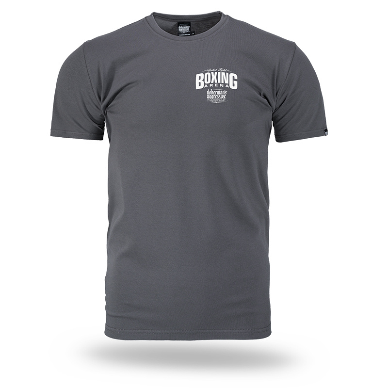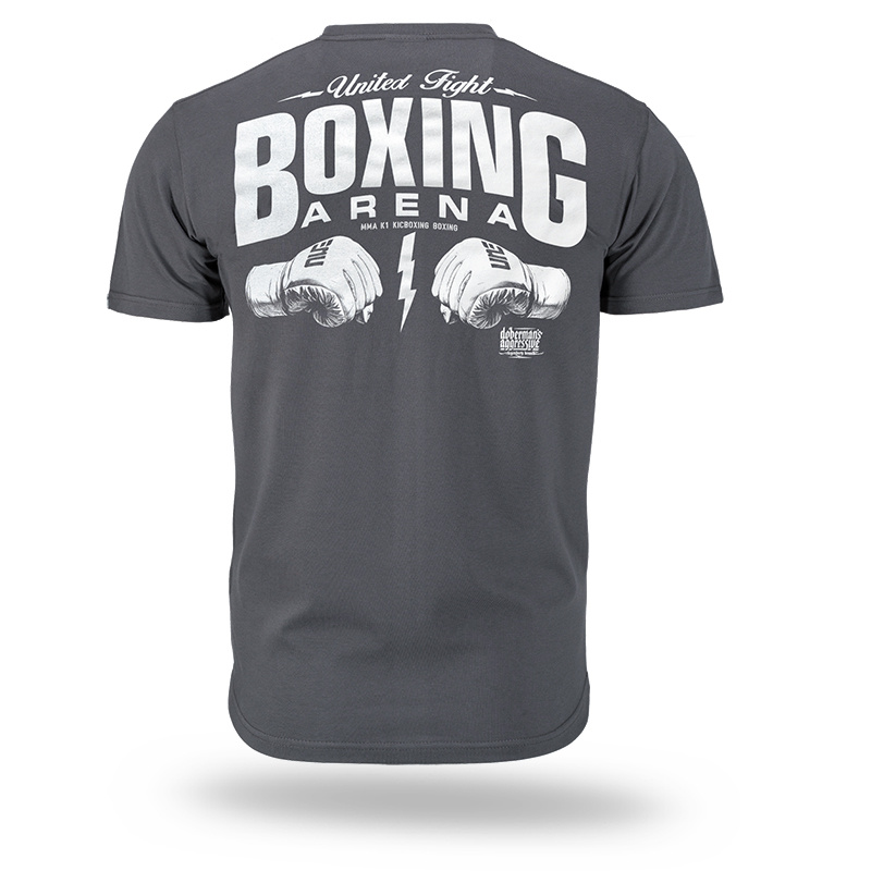 Model with a sporty graphic print on the back, depicting clenched MMA gloves and the inscription “Boxing Arena”. In the background, there are smaller inscriptions: MMA, K1, KICKBOXING, BOXING. A smaller print referring to the main motif is placed on the chest. Comfortable cut made from high-quality cotton. Model designed for combat sports practitioners.
