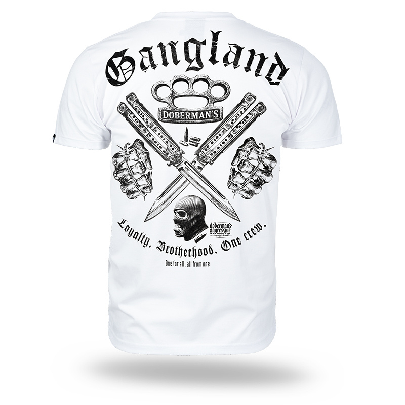 On the back, there is a bold print featuring brass knuckles, butterfly knives, clenched fists, and a figure in a balaclava. Below are the slogans: Loyalty. Brotherhood. One crew. and One for all, all for one. On the front, at chest level, there is a smaller print with brass knuckles and the Doberman's inscription.