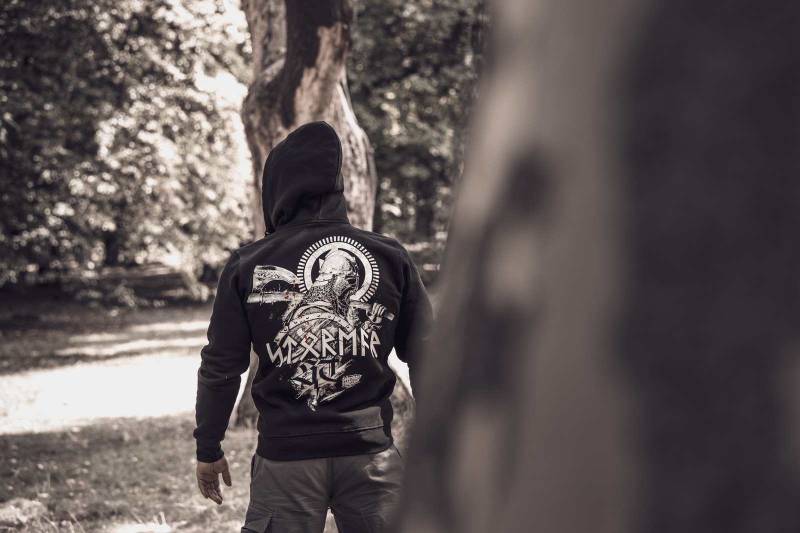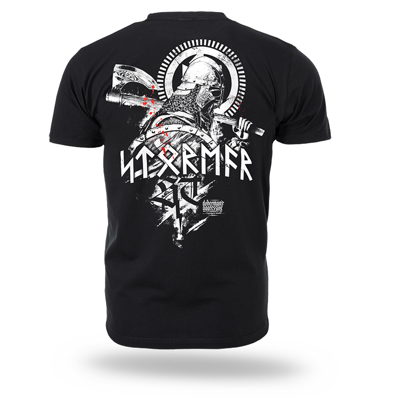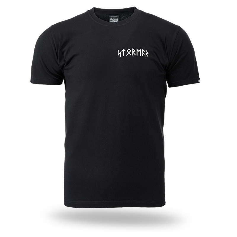 The model stands out with an impressive back print featuring a Norse warrior in a helmet, holding a shield and an axe. The design is completed with a large “STORMER” inscription styled in runic alphabet, which also appears on the front chest.