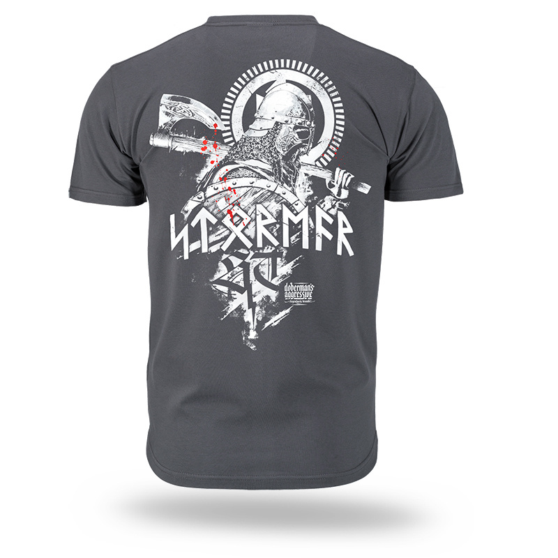 The model stands out with an impressive back print featuring a Norse warrior in a helmet, holding a shield and an axe. The design is completed with a large “STORMER” inscription styled in runic alphabet, which also appears on the front chest.