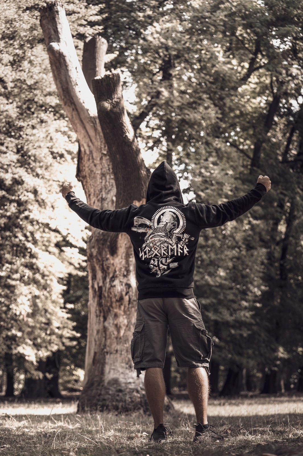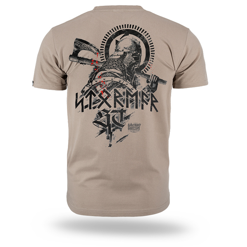 The model stands out with an impressive back print featuring a Norse warrior in a helmet, holding a shield and an axe. The design is completed with a large “STORMER” inscription styled in runic alphabet, which also appears on the front chest.
