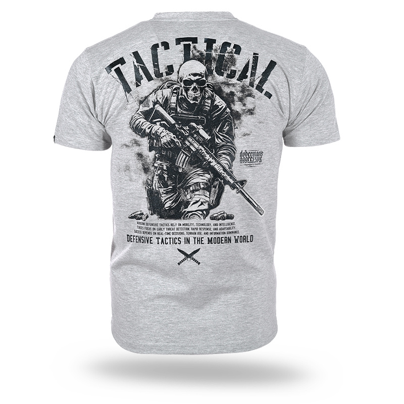 On the back, there is a dynamic print showing a skeleton with a rifle in a combat composition with the slogan "TACTICAL". Below it is the phrase "Defensive tactics in the modern world" along with additional English text. A smaller graphic motif with two crossed knives is placed on the front.