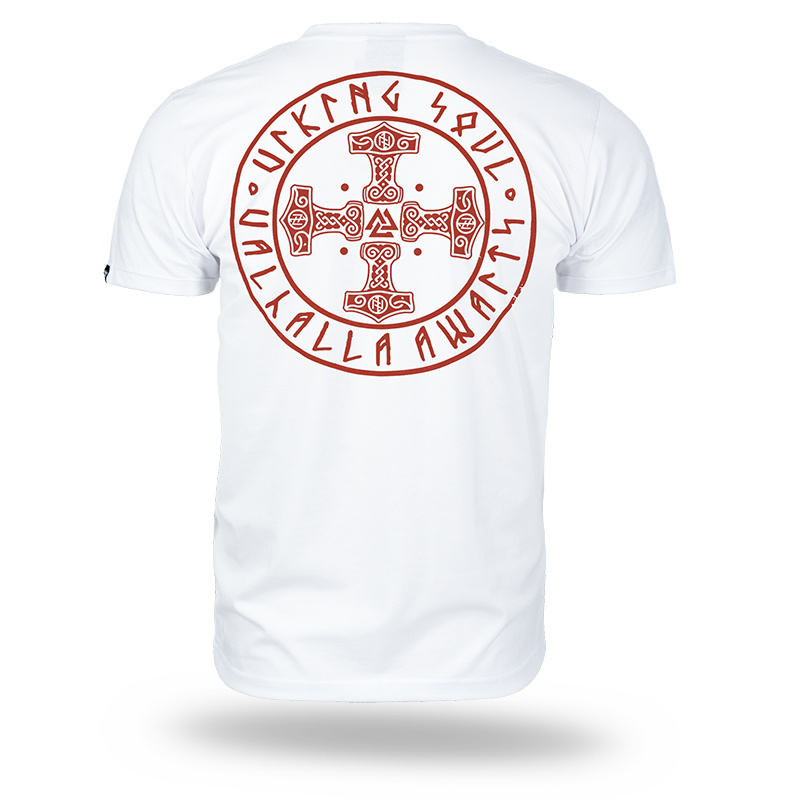 This model stands out with a back print featuring a Nordic cross decorated with runic inscriptions and Viking symbols. The inscriptions read: VIKING SOUL – VALHALLA AWAITS. A smaller print referencing the main design is placed on the chest.