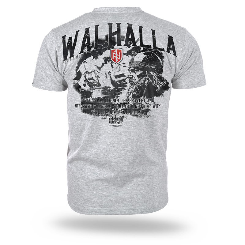 A classic T-shirt made of high-quality cotton, ensuring comfort while wearing. The front features a subtle logo in the form of a small crest, giving it a minimalist character. The back of the T-shirt is decorated with a large graphic of a Viking against the background of ships, surrounded by the inscription "WALHALLA." The design is enhanced with the text: "To Walhalla go only the bravest and strongest warriors to feast and fight with the gods in eternal glory," emphasizing its reference to Norse mythology. A model dedicated to those who appreciate raw aesthetics and Viking-inspired motifs.