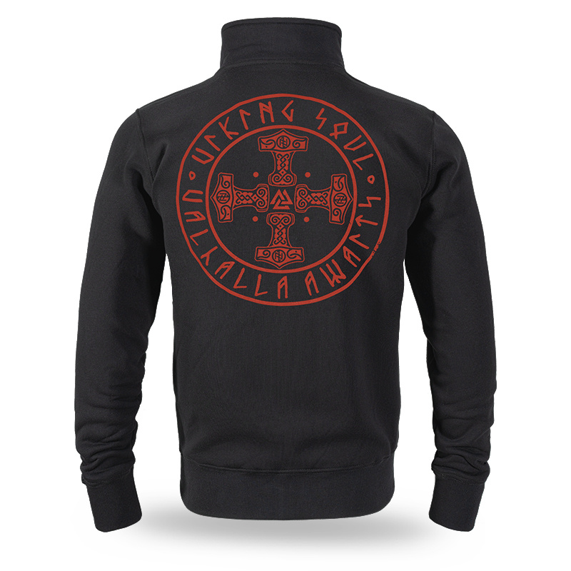 This model stands out with a back print featuring a Nordic cross decorated with runic inscriptions and Viking symbols. The inscriptions read: VIKING SOUL – VALHALLA AWAITS. A smaller print referencing the main design is placed on the chest.