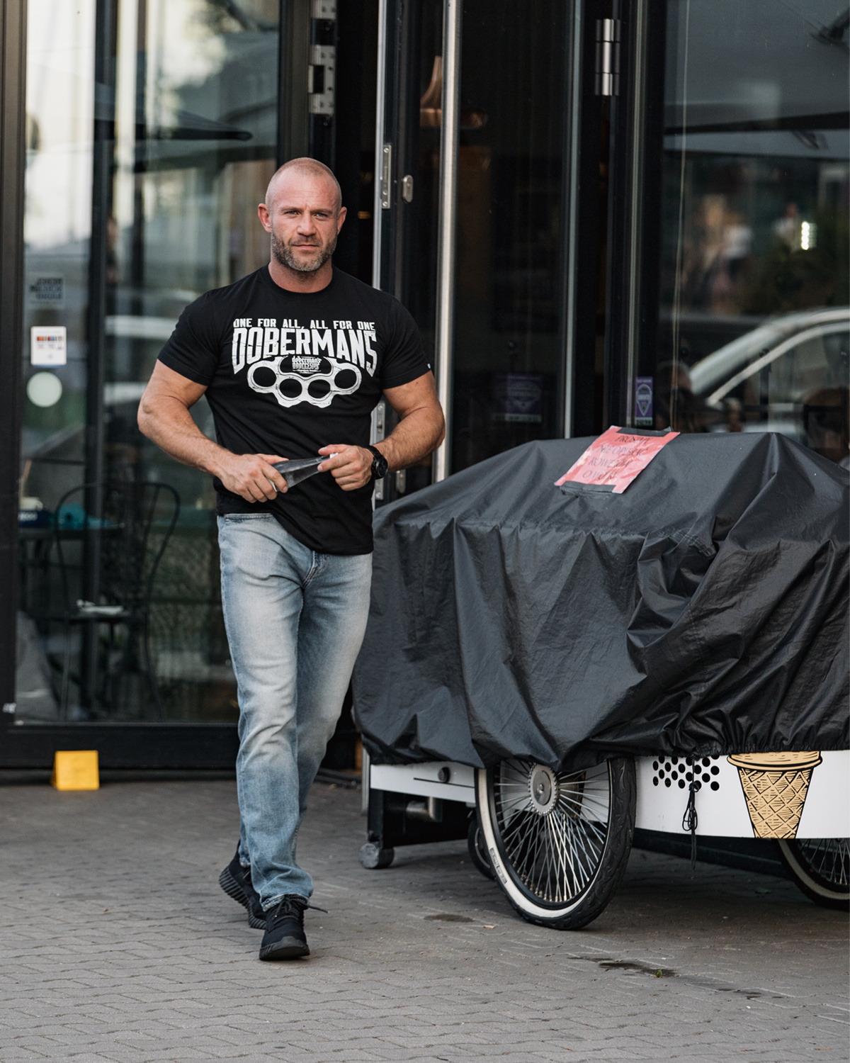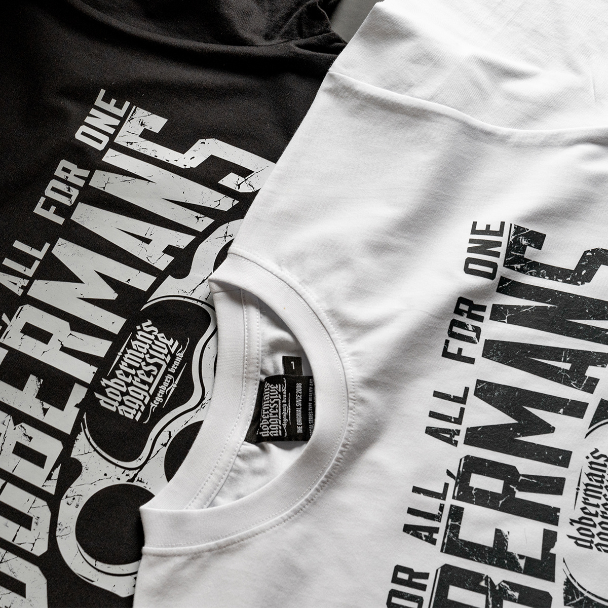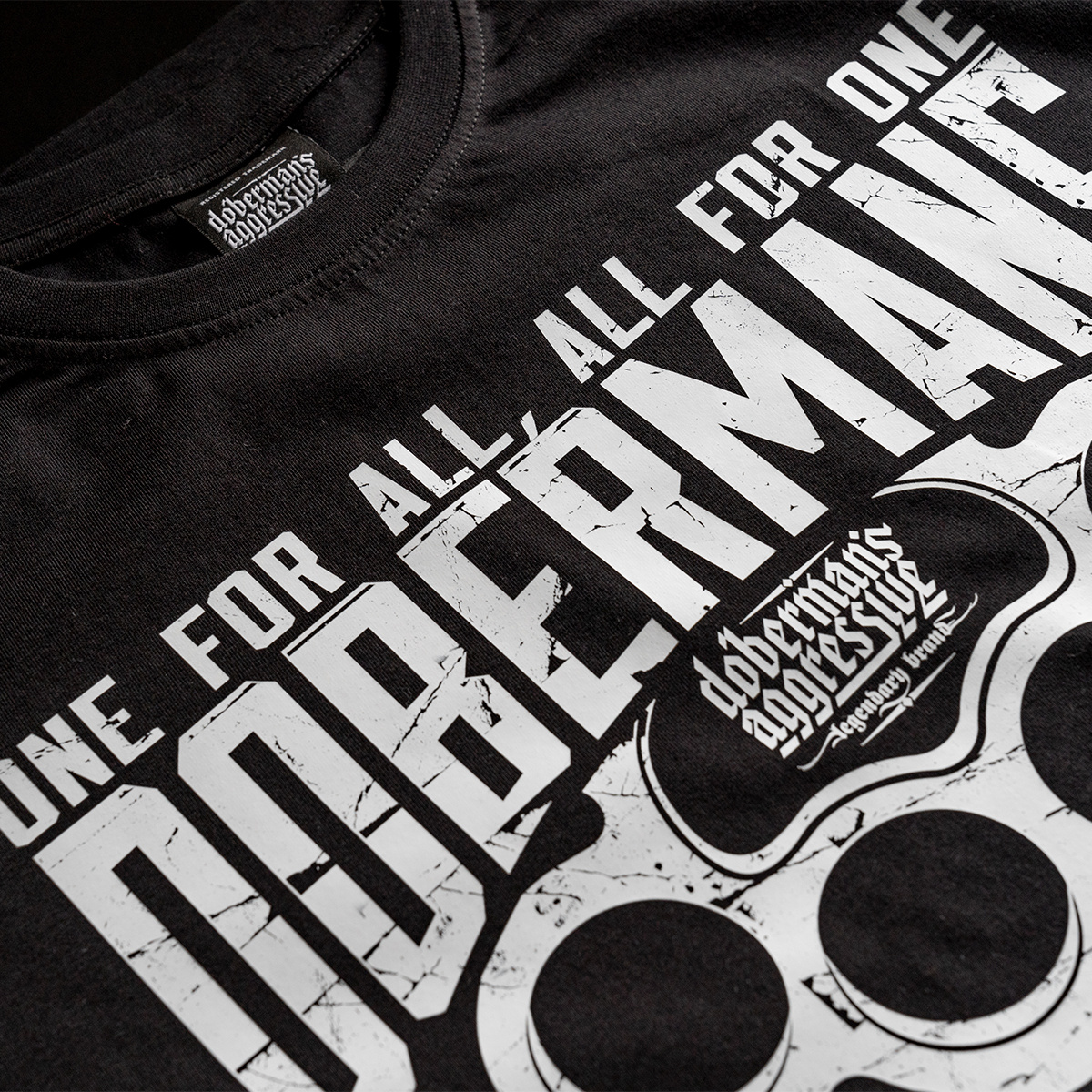 Clothing made of 200g cotton. On the left sleeve a small label with the logo Doberman's Aggressive. On the front of the T-shirt a large letter DOBERMANS with the letter One For All, All For One. All finished with the graphic box and the brand logo.