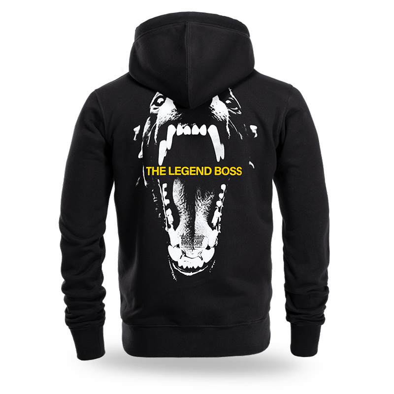 A small “THE LEGEND BOSS” inscription on the chest and a large graphic on the back featuring an open dog’s mouth with the phrase “THE LEGEND BOSS” in contrasting color. The product is made of high-quality cotton for comfortable wear.