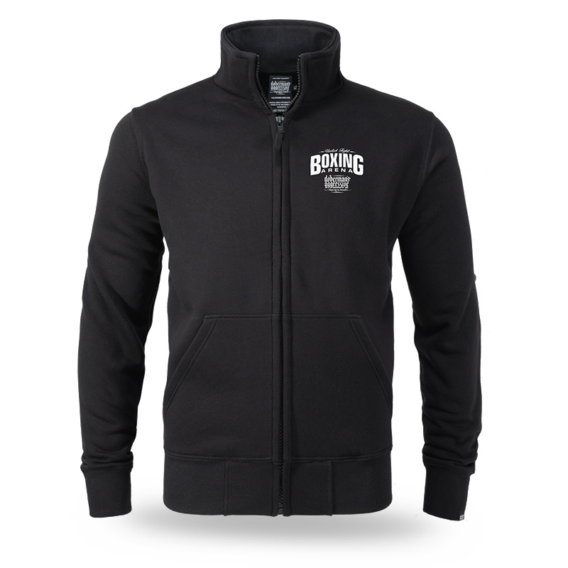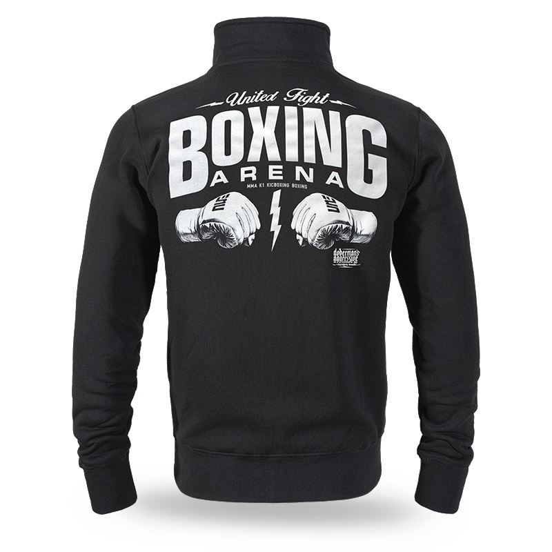 Model ze sportowym nadrukiem graficznym na plecach, przedstawiającym zaciśnięte rękawice MMA i napis Boxing Arena. W tle znajdują się mniejsze napisy: MMA, K1, KICKBOXING, BOXING. Na piersi umieszczony mniejszy nadruk nawiązujący do głównego motywu. Wygodny fason wykonany z bawełny wysokiej jakości. Model skierowany do osób trenujących sporty walki.