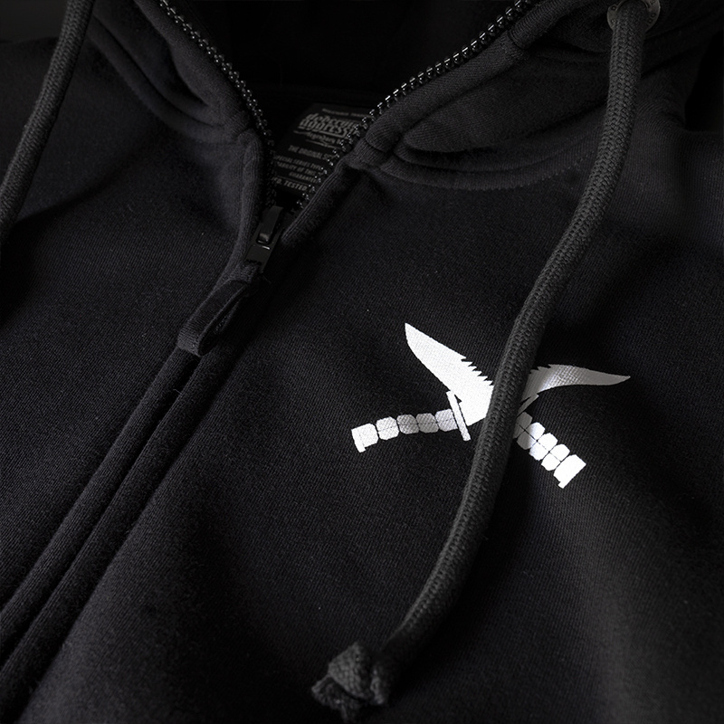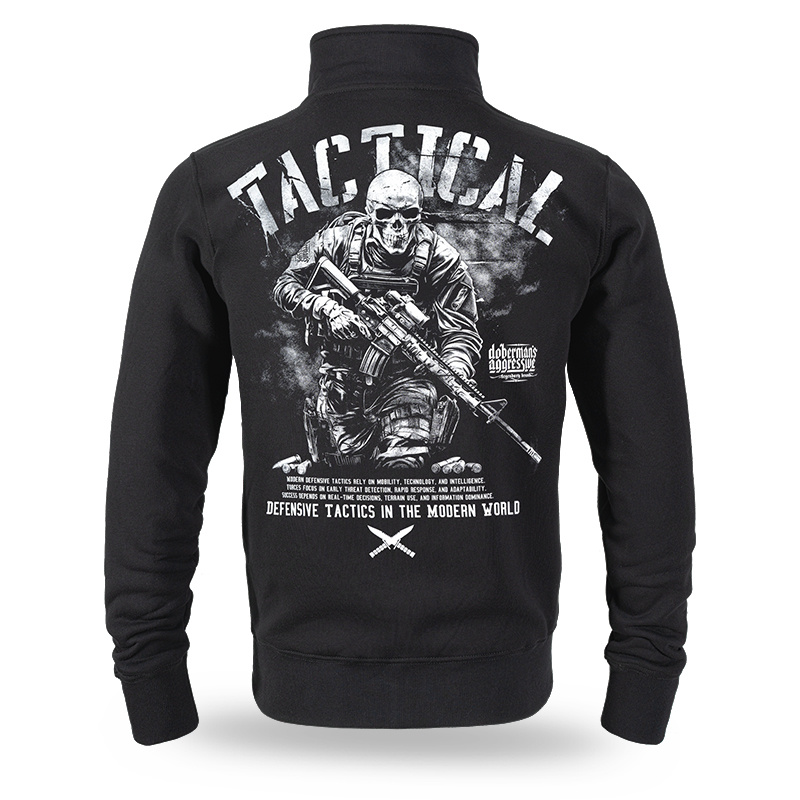 Z tyłu znajduje się dynamiczny nadruk przedstawiający szkielet z karabinem w kompozycji bojowej z hasłem „TACTICAL”. Poniżej umieszczono napis „Defensive tactics in the modern world” oraz dodatkowy tekst w języku angielskim. Z przodu widoczny jest mniejszy motyw graficzny z dwoma skrzyżowanymi nożami.