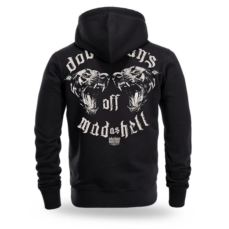 Model z odważnym nadrukiem na plecach, przedstawiającym dwa rozwścieczone dobermany i hasło „Dobermans off mad as hell”. Z przodu znajduje się mniejszy nadruk z tym samym motywem graficznym.