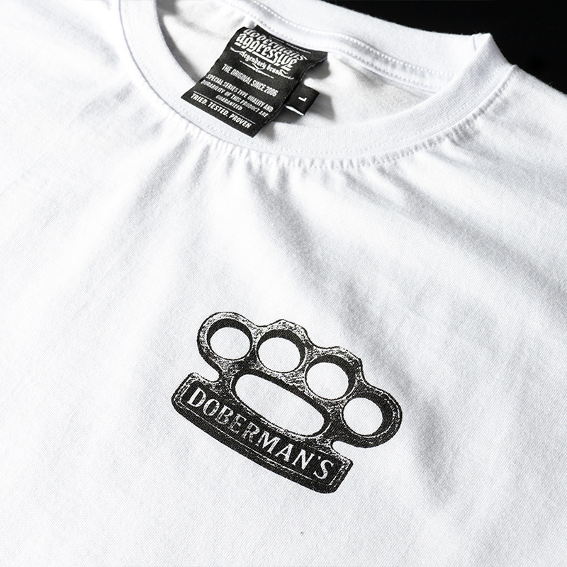 Na plecach znajduje się odważny nadruk z grafiką kastetów, noży motylkowych, zaciśniętych pięści i postaci w kominiarce. Poniżej widnieją hasła: Loyalty. Brotherhood. One crew. oraz One for all, all for one. Z przodu, na piersi, umieszczono mniejszy nadruk z kastetem i napisem Doberman's.