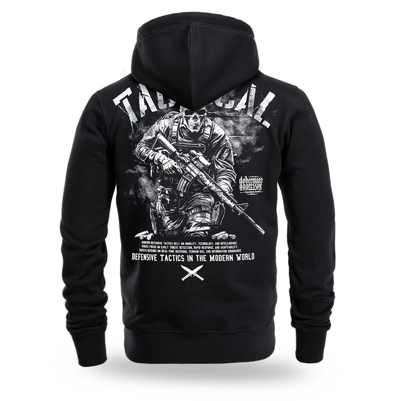 Z tyłu znajduje się dynamiczny nadruk przedstawiający szkielet z karabinem w kompozycji bojowej z hasłem „TACTICAL”. Poniżej umieszczono napis „Defensive tactics in the modern world” oraz dodatkowy tekst w języku angielskim. Z przodu widoczny jest mniejszy motyw graficzny z dwoma skrzyżowanymi nożami.