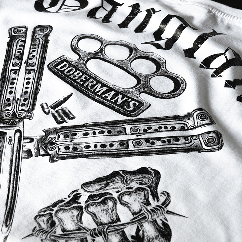 Na plecach znajduje się odważny nadruk z grafiką kastetów, noży motylkowych, zaciśniętych pięści i postaci w kominiarce. Poniżej widnieją hasła: Loyalty. Brotherhood. One crew. oraz One for all, all for one. Z przodu, na piersi, umieszczono mniejszy nadruk z kastetem i napisem Doberman's.
