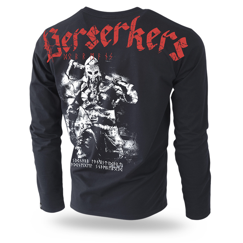Przy szyi ściągacz. Detale w postaci czerwonej lamówki i bocznej wszywki z logo. Z przodu poziomy nadruk wzdłuż lewego szwu. Użyto symboli runicznych. Tył zdobiony dużą dwukolorową grafiką z postacią wikinga trzymającego topór. Wysoko na plecach napis Berserkers przechodzący przez szwy obu rękawów.