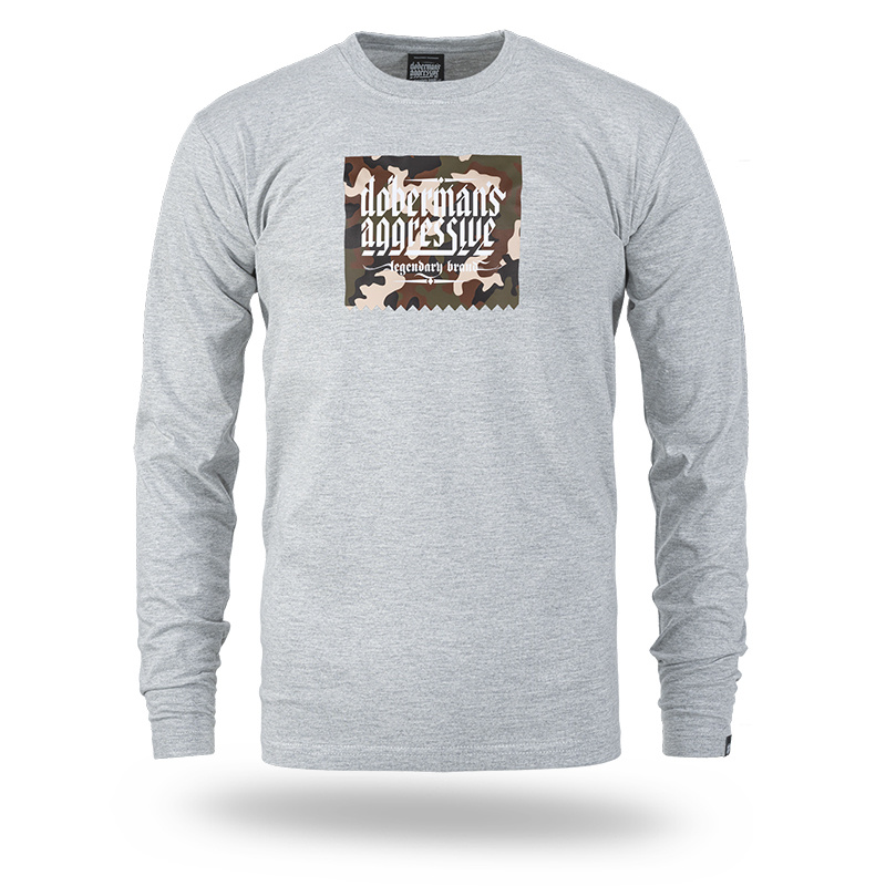 Na klatce piersiowej znajduje się nadruk w formie prostokąta z motywem kamuflażu, na którym umieszczono logo marki Dobermans Aggressive.