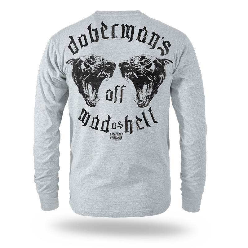 Model z odważnym nadrukiem na plecach, przedstawiającym dwa rozwścieczone dobermany i hasło „Dobermans off mad as hell”. Z przodu znajduje się mniejszy nadruk z tym samym motywem graficznym.