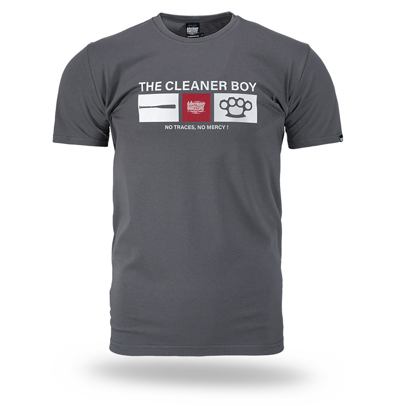 W centralnej części znajduje się nadruk z napisem „THE CLEANER BOY” oraz grafikami przedstawiającymi pałkę, logo marki i kastet. Poniżej hasło: „NO TRACES, NO MERCY!”. Produkt wykonany z wysokiej jakości bawełny, gwarantującej komfort noszenia.