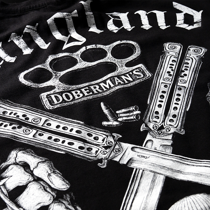 Na plecach znajduje się odważny nadruk z grafiką kastetów, noży motylkowych, zaciśniętych pięści i postaci w kominiarce. Poniżej widnieją hasła: Loyalty. Brotherhood. One crew. oraz One for all, all for one. Z przodu, na piersi, umieszczono mniejszy nadruk z kastetem i napisem Doberman's.