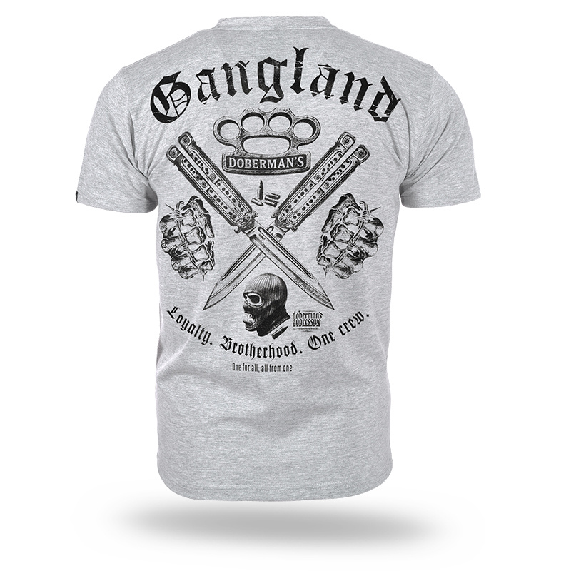 Na plecach znajduje się odważny nadruk z grafiką kastetów, noży motylkowych, zaciśniętych pięści i postaci w kominiarce. Poniżej widnieją hasła: Loyalty. Brotherhood. One crew. oraz One for all, all for one. Z przodu, na piersi, umieszczono mniejszy nadruk z kastetem i napisem Doberman's.