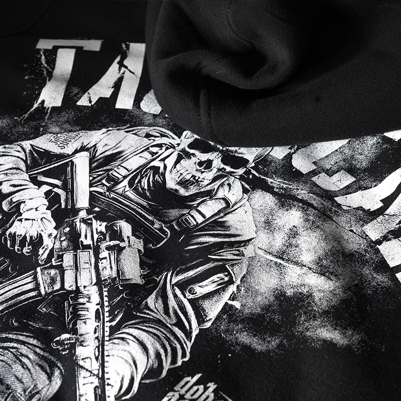 Z tyłu znajduje się dynamiczny nadruk przedstawiający szkielet z karabinem w kompozycji bojowej z hasłem „TACTICAL”. Poniżej umieszczono napis „Defensive tactics in the modern world” oraz dodatkowy tekst w języku angielskim. Z przodu widoczny jest mniejszy motyw graficzny z dwoma skrzyżowanymi nożami.