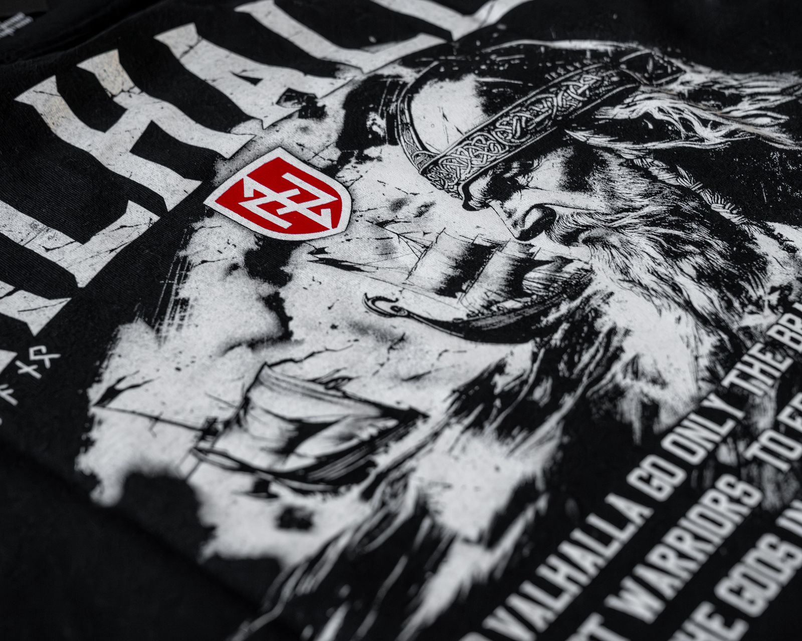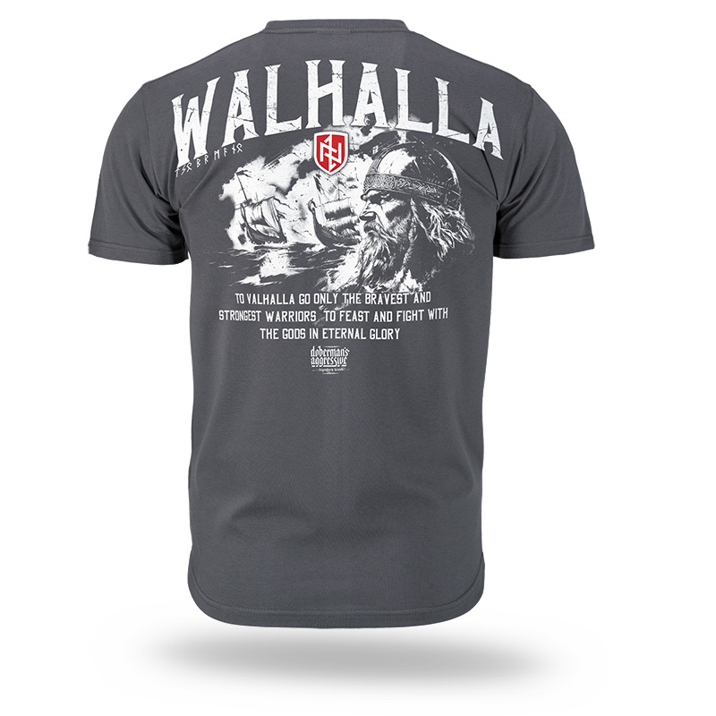 Klasyczna koszulka wykonana z wysokogatunkowej bawełny, zapewniającej komfort noszenia. Na froncie umieszczono subtelne logo w postaci niewielkiego herbu, nadającego minimalistyczny charakter. Tył koszulki zdobi duża grafika przedstawiająca wikinga na tle okrętów, otoczona napisem „WALHALLA”. Wzór wzbogacony jest o tekst: "To Walhalla go only the bravest and strongest warriors to feast and fight with the gods in eternal glory", podkreślający nawiązanie do mitologii nordyckiej. Model przeznaczony dla osób ceniących surową estetykę i motywy inspirowane kulturą wikingów.