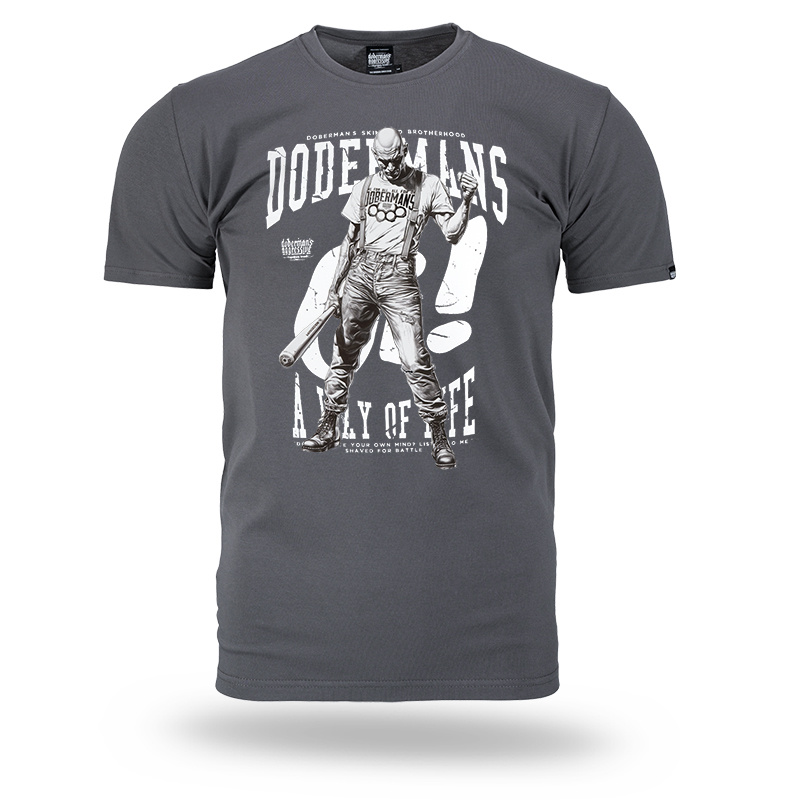 Koszulka wykonana z wysokiej jakości bawełny, zapewniająca wygodę i trwałość. Na froncie znajduje się duży, szczegółowy nadruk przedstawiający postać Skinheads z kijem baseballowym w dłoni. W tle widnieje duże logo oraz napis „DOBERMANS A WAY OF LIFE”, nadający całości surowy, uliczny charakter. Model dedykowany osobom ceniącym odważne wzory i styl inspirowany subkulturami ulicznymi.